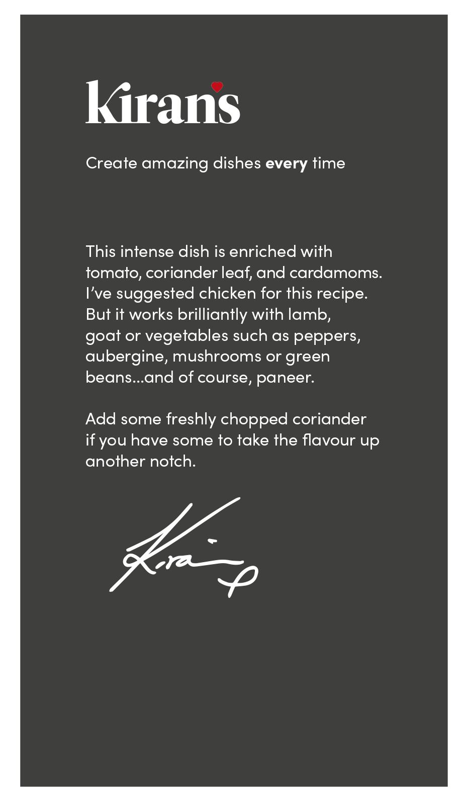 This intense blend is enriched with tomato, coriander leaf, and cardamoms. I’ve suggested chicken for this recipe. But it works brilliantly with lamb and goat. Or vegetables such as peppers, aubergine, mushrooms and green beans. And of course, paneer.