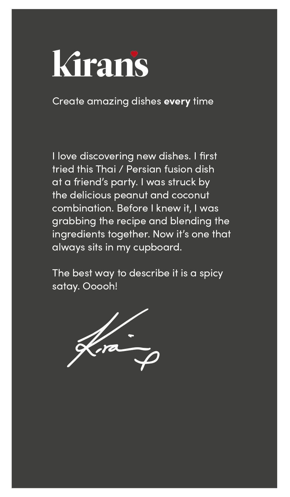 I love discovering new dishes. I first had this Thai / Persion fusion at a friend’s party. I was struck by the delicious peanut & coconut combination. Delicious. Before I knew it, I was grabbing the recipe and working on blending the ingredients together. Now it’s one of the Spice Kits that's earned its place in my kitchen cupboard.