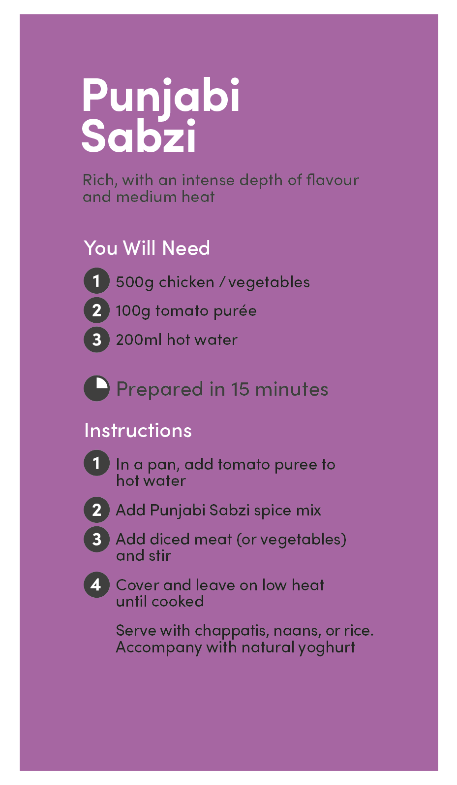Lots of notes in this flavoursome "sabzi". A tomato based dish, enriched with ginger, garlic, cumin, fenugreek...to name but a few. A perfect balance of flavours. This one has a little more "zing" so we've given it a 2-chilli rating. But feel free to add some chopped chilli or dried chilli flakes if you like your curry hot.